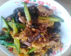 - 5. 倒入鸡蛋,黄瓜,木耳,肉丝,有胡萝卜的也放进去,在加一勺白糖,少许咸盐,老抽。