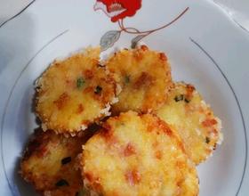 把土豆,虾仁,火腿放在碗里加上盐,胡椒粉,玉米淀粉搅匀,搓成圆饼裹上面包糠。