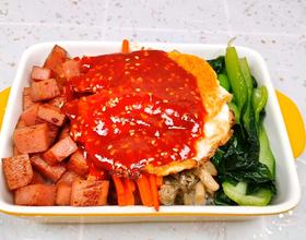 午餐肉切块,胡萝卜切丝,蘑菇和青菜洗净备用