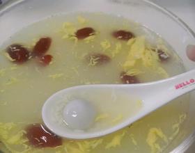 放入小汤圆,待汤刚刚圆飘起来,放入米酒、红枣、枸杞,锅内水重新滚起来,打入一个鸡蛋搅碎