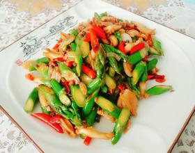 - 5. 放入芦笋,蚝油,白醋,糖,盐,翻炒5分钟,放入白胡椒,装盘