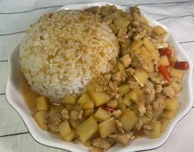 猪肉炒至变色后倒入准备好的蒜泥小米椒