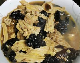 加入清水,加香菇、木耳,用生抽、老抽调味调色。水开后下面筋泡、腐竹,开中火煮一会,至合适自己口感,用鸡精调味即可。