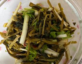 将干的橄榄菜用冷水浸泡1小时。如果是热水几分钟就可以,但是要注意别泡软了,那样很影响口感。