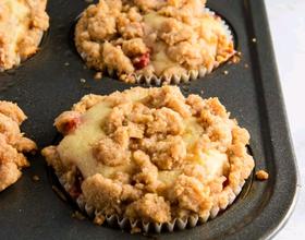 - 4. 之后拌入草莓粒搅拌均匀。在一个小碗中,将面粉,糖,香草和肉桂搅拌在一起。