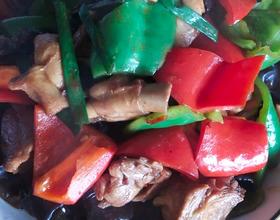 调入盐,鸡精,倒入青红辣椒,炒一分钟