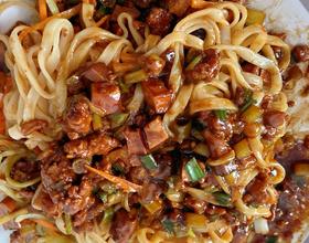 - 4. 将水烧开,下入面条,熟后捞出。淋上熬好的酱,再放上切好的黄瓜和胡萝卜丝。搅拌均匀即可。