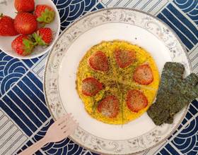 小火慢煎至定型,摆上草莓,撒上海苔碎