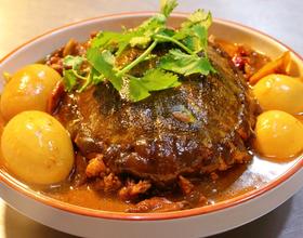 炒香之后下入甲鱼。甲鱼下锅之后,加入黄豆酱蚝油,老抽。料酒在锅中炒出香味儿。加入适量的水,没过甲鱼即可。 再下入4个煮好的鸡蛋。