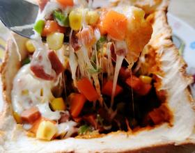 往面包盅加入一些炒好的配料,撒上一层芝士碎,再把剩余的倒入…