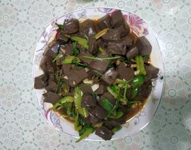放入羊血翻炒 再放入青椒