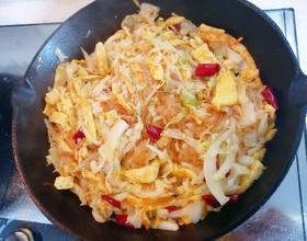 - 1. 准备好食材,小粉丝提前用冷水泡15分钟,将包菜切丝,鸡蛋在碗里打散,加些料酒搅匀备用。