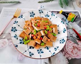放上辣椒点缀,拍上成品图一道清爽又美味的毛豆炒香干就完成了。