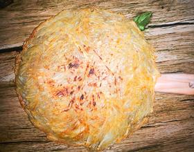 锅加热放入冷油加一点点盐在锅底、然后放入土豆丝摊平修圆用小火