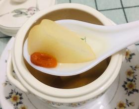 把梨放入蒸盅内,放入红枣、枸杞和冰糖。