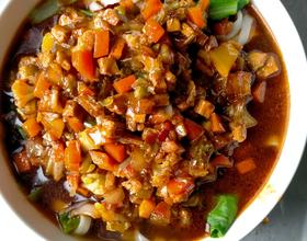 - 6. 放入葱花,胡萝卜丁翻炒1分钟,再到一碗水