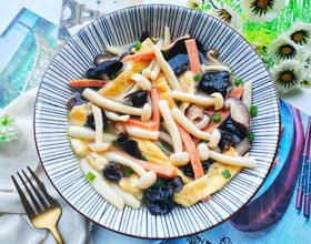 所有食材洗净切好,锅中烧开水,放入所有菌菇焯水2分钟捞出。鸡蛋煎熟切条。锅中少油,放姜丝炒香,放入所有菌菇类翻炒,加入一碗水煮开,
