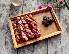 手抓饼涂抹紫薯馅的量,看个人酌情添加。 请根据自家烤箱的情况来适量调节温度和时间。 最后几分钟的时候可以在一旁观察,避免烤糊。