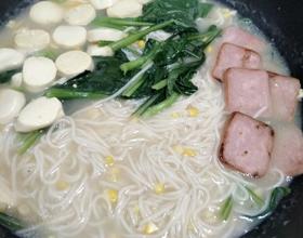 - 8. 待面条煮到8成熟时,放入青菜,午餐肉,玉子豆腐。盖上锅盖,大火滚2分钟左右,就可以关火,开吃啦~