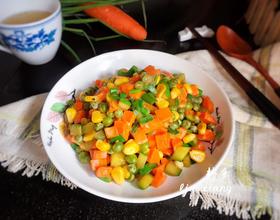先放入胡萝卜煮沸,接着加入豌豆米和玉米粒煮熟