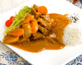 另起砂锅,下油、洋葱、牛肉翻炒;水、咖喱块、盐、黑巧克力,加盖炖煮40分钟