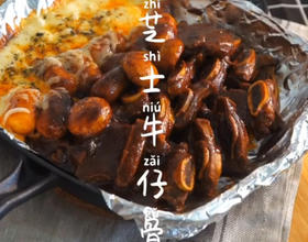 铺上锡箔纸,放上牛仔骨和芝士,加热烤化即可