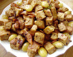 - 1. 将大豆腐清洗干净,切成小块,装入盘中待用。