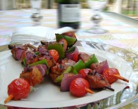洋葱,青椒切段,和樱桃小番茄,里脊肉块间隔串在竹签上
