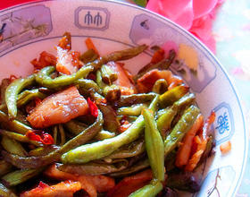下入豆角翻炒,调入两勺生抽,一滴蚝油,撒入适量花椒粉,盐,鸡精翻炒均匀即可。