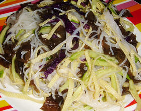 黄瓜、干豆腐、紫甘蓝切成细丝。