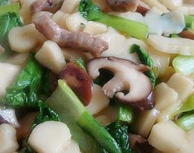 准备好材料,将青菜切好,青菜梗与青菜叶分开装盘,年糕、香菇、猪肉切好备用。