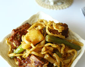 再放入豆角和土豆,翻炒均匀加入老抽上色,再放入适量的水,水要没过菜,烧开后,盛出一小碗待用;擀好的面切成喜欢的粗细,均匀铺在菜上,盖上锅盖,中火焖15-20分钟,根据面的多少来决定时间;