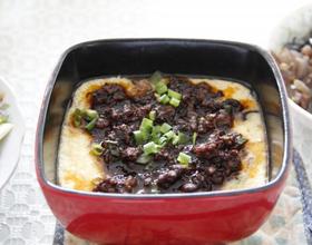 - 4. 先把蛋放上蒸锅蒸大概12分钟的样子这个时候我们来炒炸酱多放点点油然后中小火入肉末放少量料酒可以让肉末口感更好等肉末变色、分散时加入酱(因为我家妞妞是云南的所以这里用的是云南的辣酱其实事实证明用甜面酱和黄豆酱味道也特别好只是颜色上稍微差一点)煸炒片刻后放入适量的盐和糖关火炸酱炒好了