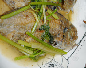 鱼洗净,去腮去肚,洗净鱼肚的黑膜,鱼身两面用盐腌一下。