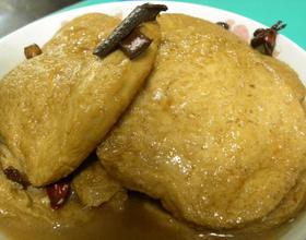 - 5. 把煎好的素鸡倒入锅中,依次加入鲜酱油30G、糖20G、上色后,再加入水或高汤(沒过素鸡),煮上10分钟,待汤汁收干即可。(另一种是你想吃有汤汁的话,就再多加水或高汤,不要完全收汁)。