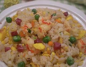 将米饭放入锅内翻炒至饭粒松软不粘。