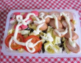 - 3. 鸡蛋煎成蛋饼切成条状,香肠煎熟切斜片,蟹棒略煎切粒状。