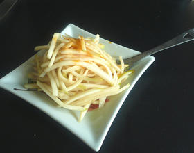 热锅冷油,放入花椒粒炒香,捞出不要,放入切好的芥菜丝翻炒。