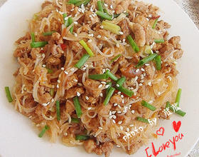 - 11. 等汤汁差不多烧干的时候,撒点鸡精,香葱,白芝麻炒匀出锅。