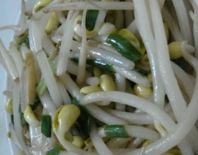 把洗净的黄豆芽放进去翻炒一会,炒至黄豆芽变软,加少许的生抽和盐调味。