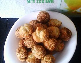- 1. 低筋面粉300g、玉米淀粉80g、白糖60g、鸡蛋2枚、花生油5羹匙、水60ml、小苏打粉4g,芝麻适量。