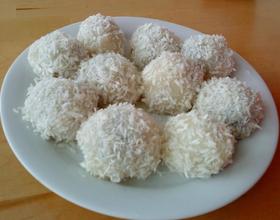 粘上椰蓉的糯米团,摆放在盘子里,就可食用.但是不能多吃,难已消化。