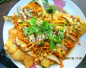 把过好油的胡萝卜丝和香菇片摆在鱼排上