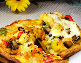 要选用水分少的蔬果,以免出汤。最好用深一点的披萨盘,我用的是方形蛋糕模具。