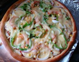 - 4. 为了使面饼酥脆不塌底,先将面饼边刷蛋液200度烤7分钟,随后将酱料抹在面饼上,逐层放上培根、虾仁、洋葱、杏鲍菇、奶酪片、豌豆玉米等最后洒些马苏里拉奶酪条。