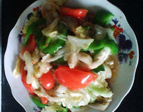 圆白菜500g、焯熟的鲜蘑200g、尖椒2个、西红柿1个。