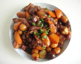 - 6. 计时40分钟后,加入鹌鹑蛋、胡萝卜块、盐,再继续炖10分钟。将调味料(大葱、大料、树椒、姜片)拣出弃之。