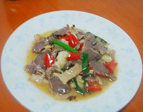 倒入腌好的肾片爆炒至变色放红二勺清水略煮。
