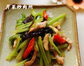 另起锅,放油,七成热后依次放入,芹菜,青红椒,黑木耳加适量的盐炒匀。