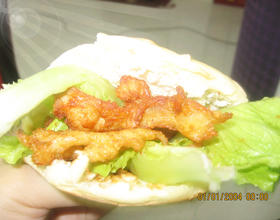 - 15. 把烙好的饼从中划开放入肉片生菜如果家里有香辣酱啊等等放里面就好了非常香呢